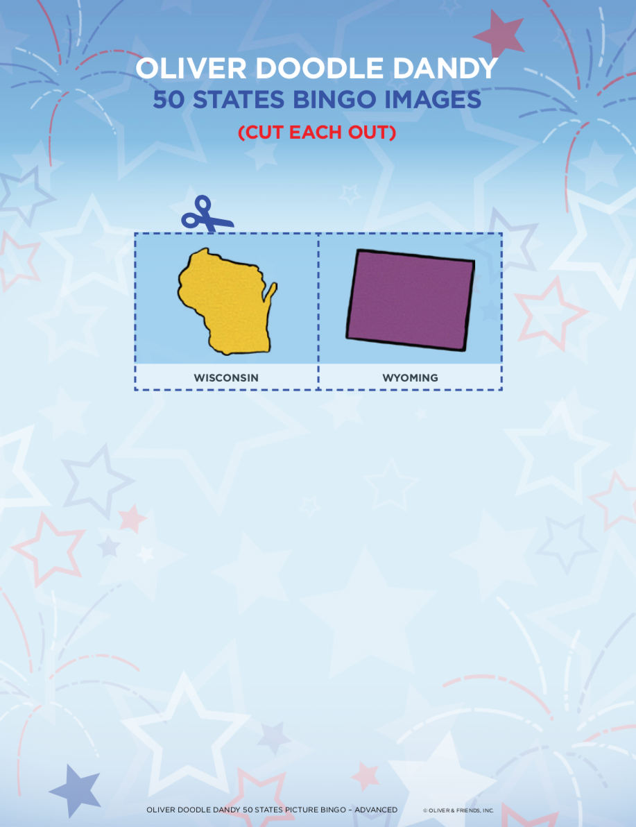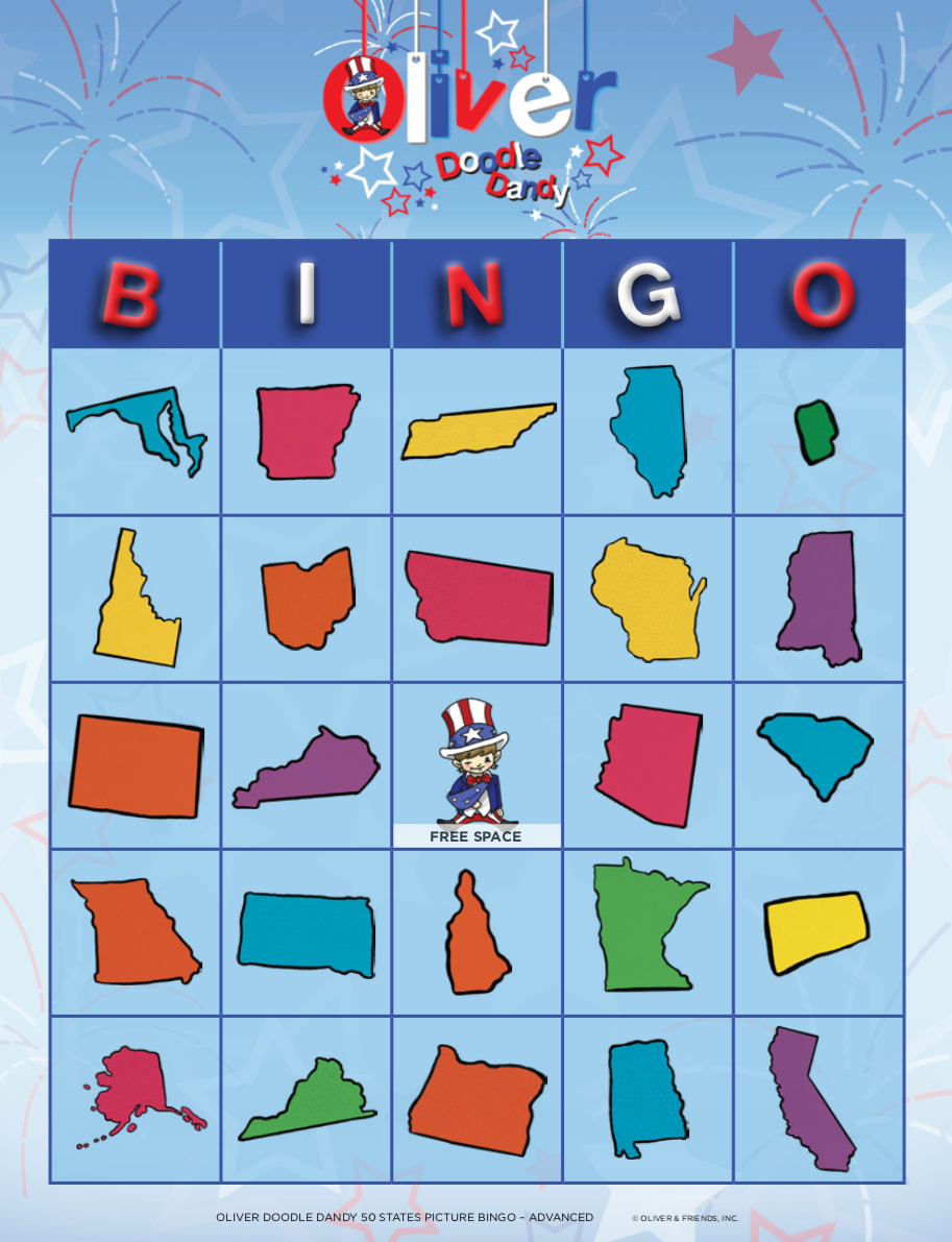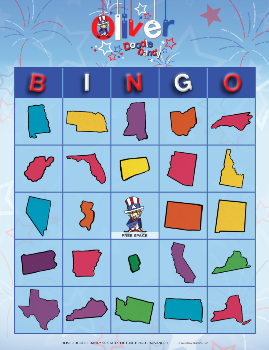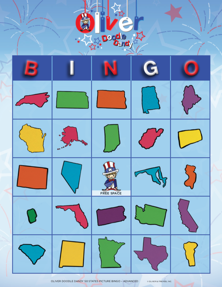 Patriotic Picture Bingo is a terrific way to have fun while teaching all about our nation. This version is a great way to teach the older children about our 50 states. The caller calls out each state by name, while the player must know what that state looks like and mark the card accordingly.