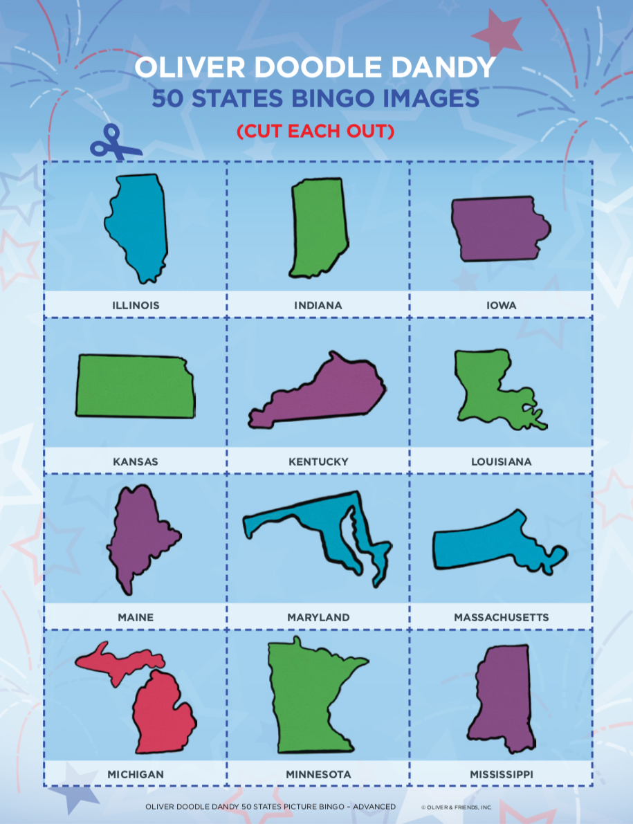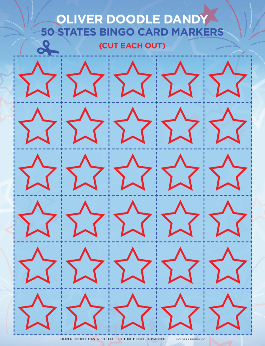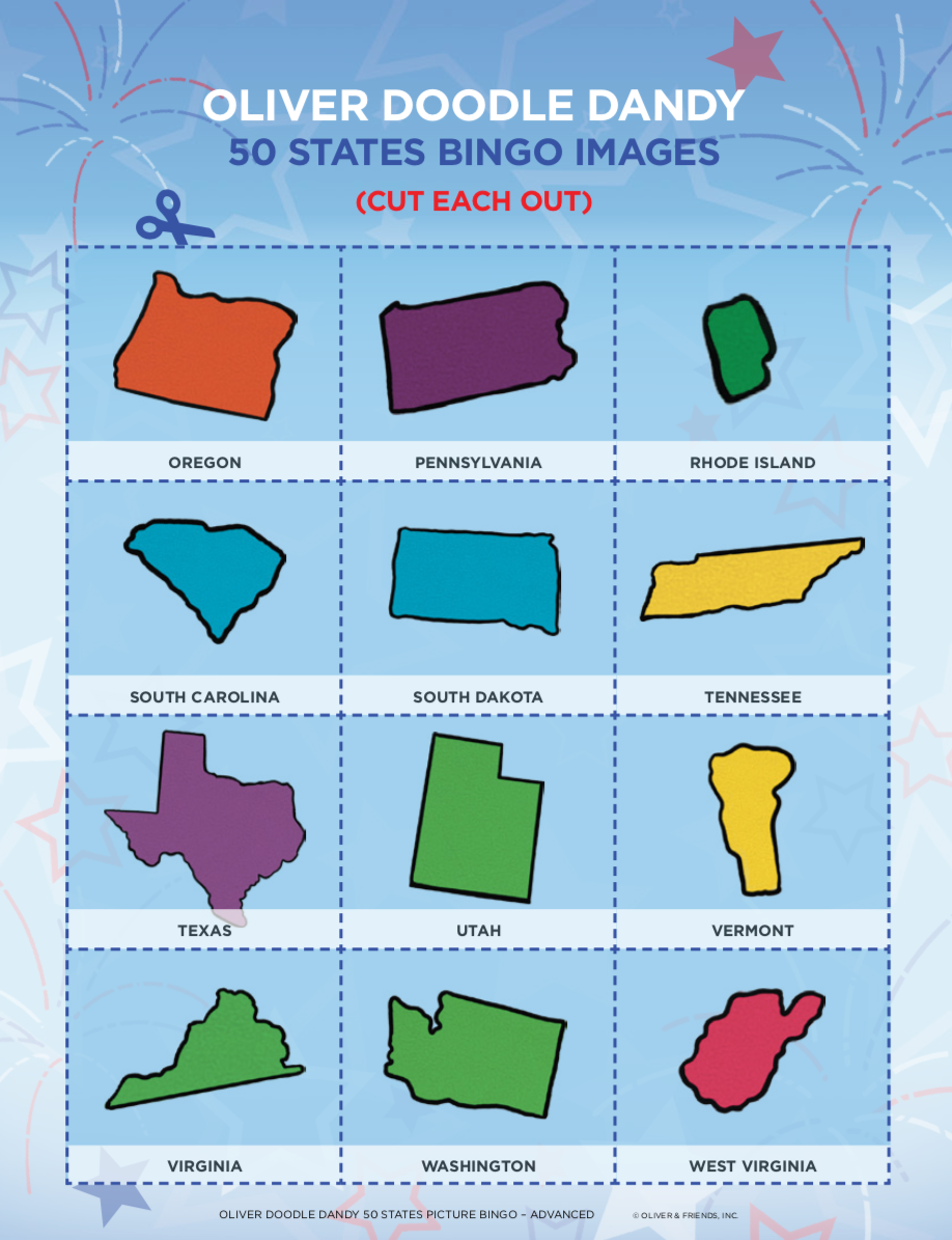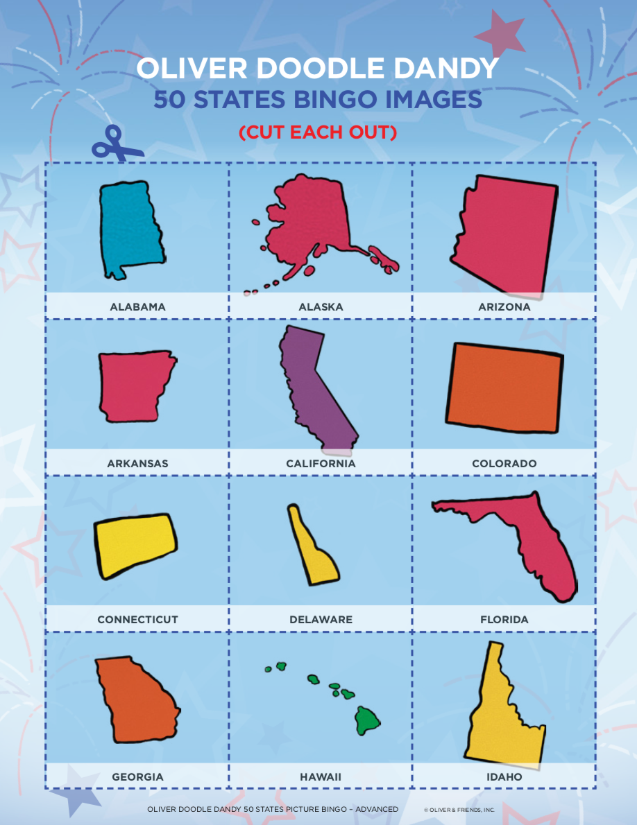 Patriotic Picture Bingo is a terrific way to have fun while teaching all about our nation. This version is a great way to teach the older children about our 50 states. The caller calls out each state by name, while the player must know what that state looks like and mark the card accordingly.