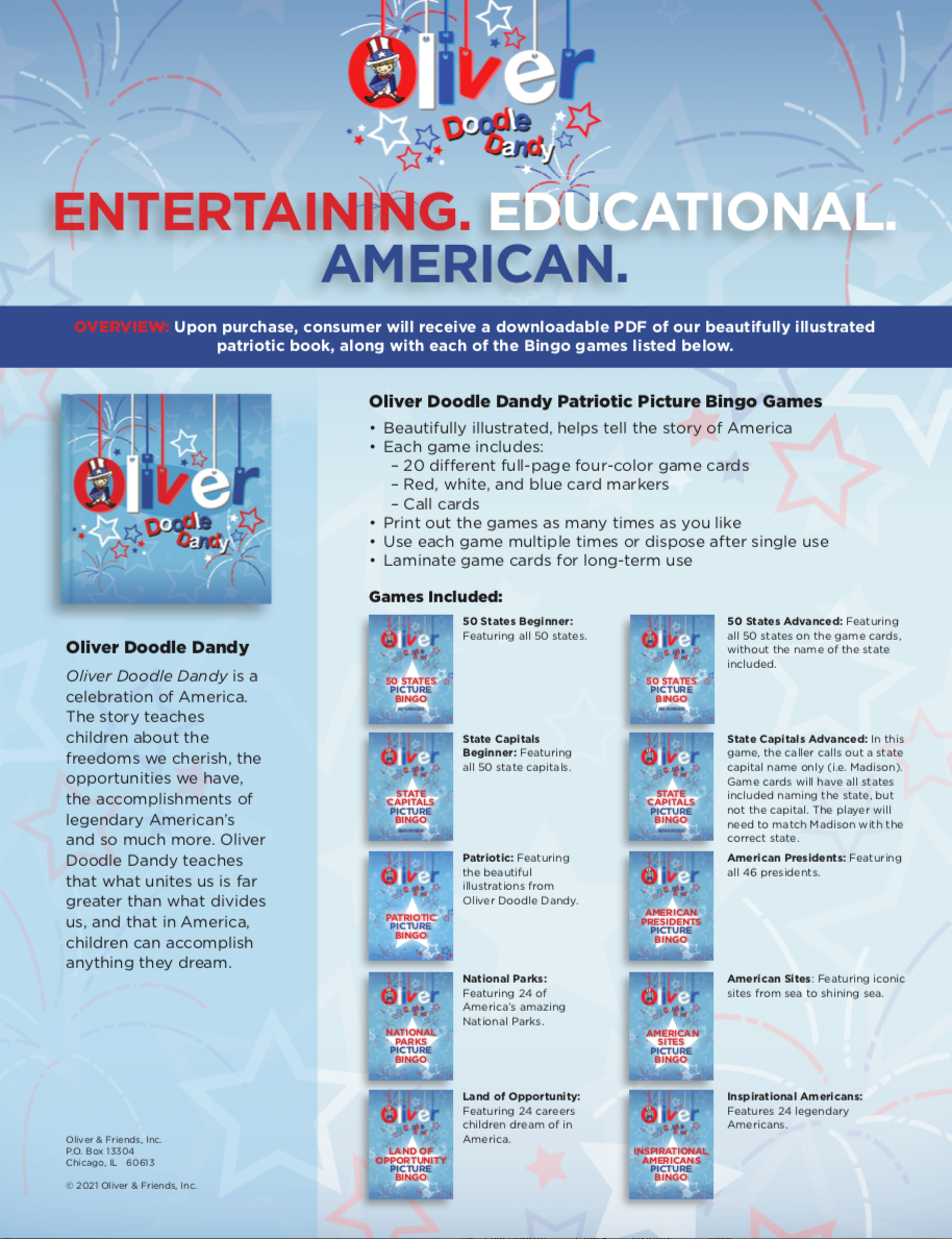 Oliver Doodle Dandy is a celebration of America. From the freedoms we cherish, to the opportunities we have, to the accomplishments of legendary American’s, Oliver Doodle Dandy shows that the American Dream is very much alive and well.